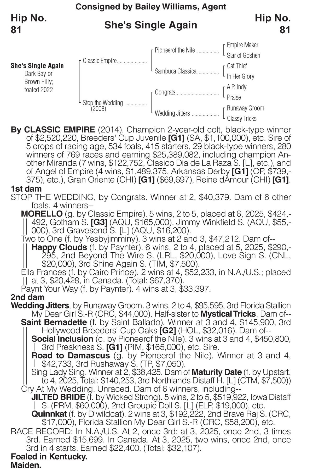 SIXTH – CATALOGUE AND ANNOUNCEMENTS: Horses catalogued in this sale are offered with information (digital or printed) as represented by Consignor. With respect to mare reproductive status, only information submitted in writing, after examination by a licensed veterinarian, will be accepted for the terms “suitable for mating”, “pregnant”, “aborted”, and “not pregnant”. The term “not pregnant” shall be construed to mean that the mare was bred, was not found to have slipped, and failed to produce a foal. The accuracy of such information is the responsibility of Consignor and not Auctioneer and has not been verified by Auctioneer. While certain information may have been procured by Auctioneer from third parties on behalf of Consignor, it remains solely the responsibility of Consignor to verify the accuracy of such information and to notify Auctioneer of any corrections. So that an appropriate announcement can be entered prior to the start of the sale, notices of corrections must be delivered in writing to Auctioneer not less than twenty-four (24) hours prior to the start of the sale.